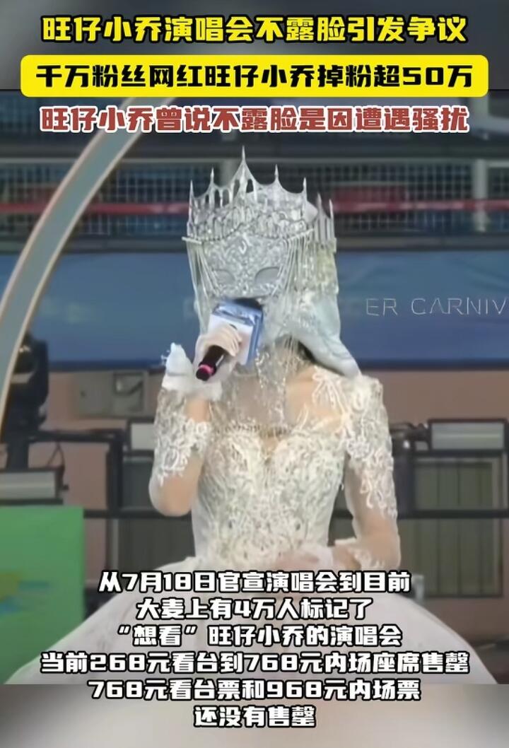还有,她一直以来遮脸的神秘感,也成了演唱会的争议点。主办方强调“薄纱面具保真唱”,但这魔幻的解释却遭群嘲,粉丝直呼“当我们是傻子吗?”此前旺仔小乔曾以“未成年遭跟踪”“校园霸凌致容貌焦虑”解释不露脸,收获了不少同情,可如今在利益面前,这些理由显得有些苍白。