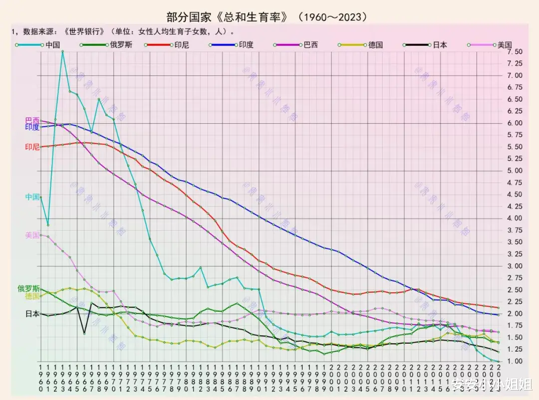 回顾1960年至2023年这超过一甲子的岁月,中国、美国和俄罗斯这三个世界大国的总和生育率轨迹,宛如三条交织却又迥异的曲线,深刻记录了各自国家政策转向、经济起伏与社会变迁的复杂故事。