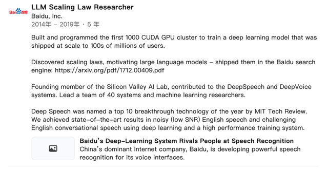 到现在他的领英界面上百度那段工作经历里还写着头衔是“大语言模型缩放定律研究员(LLM Scaling Law Researcher)”。
