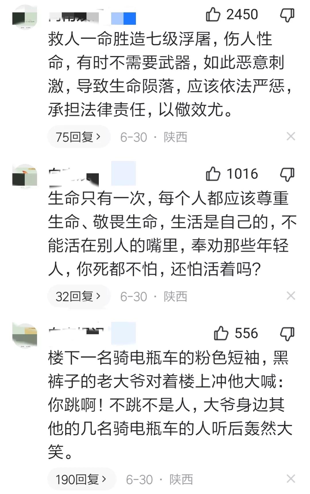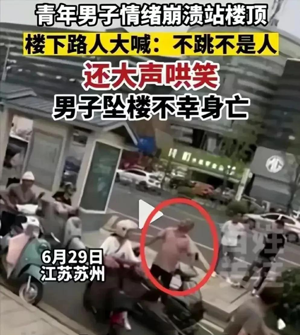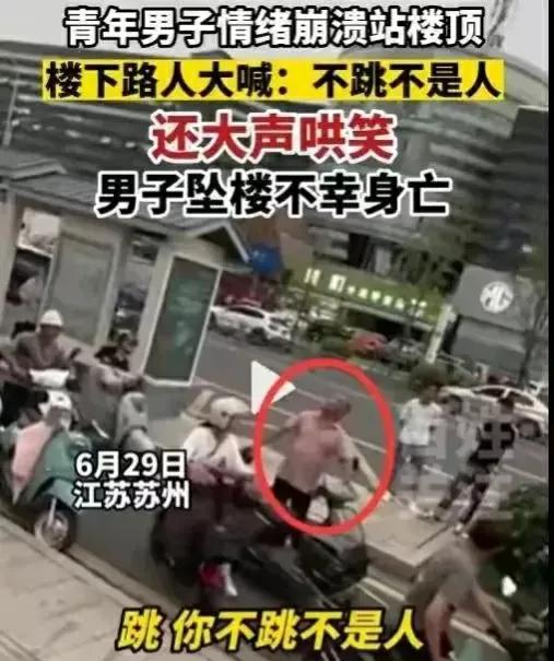 6月29日,江苏一男子站在30层楼顶,整个人心神崩溃,踌躇徘徊,楼下过路人言语刺激。“跳啊,你不跳就不是人,旁边还有人哄堂大笑。”