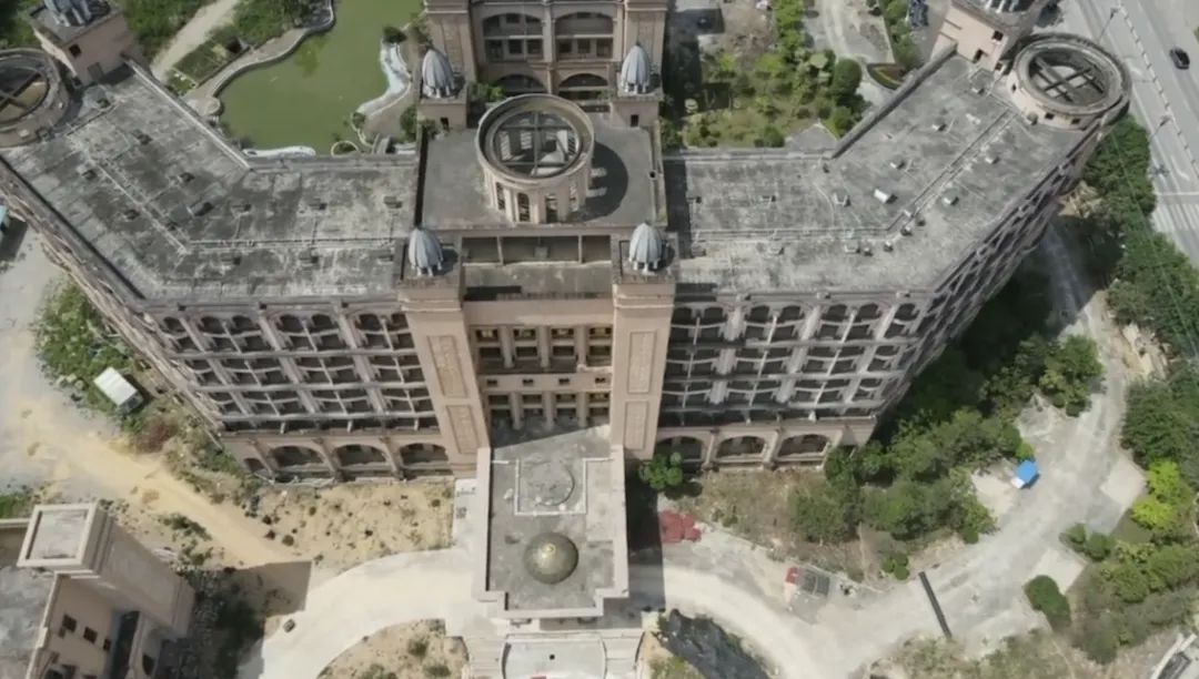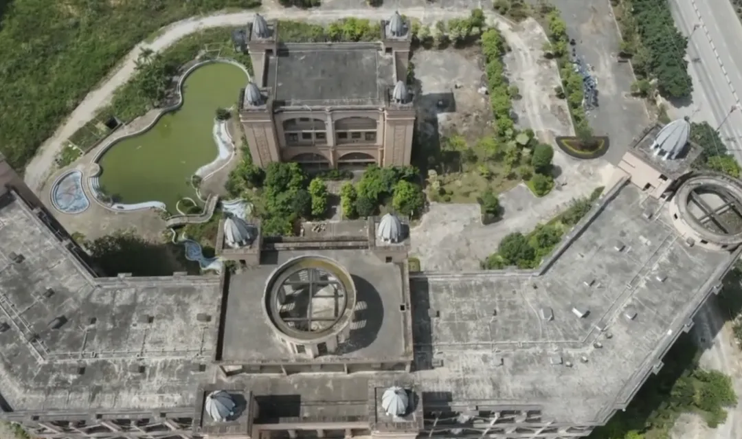 从远处望去,这座欧式风格的酒店仍能看出当年的雄心:拱形长窗、圆顶与塔楼勾勒出庄严轮廓,米色外墙本应彰显气派。可走近些,便是另一番景象。