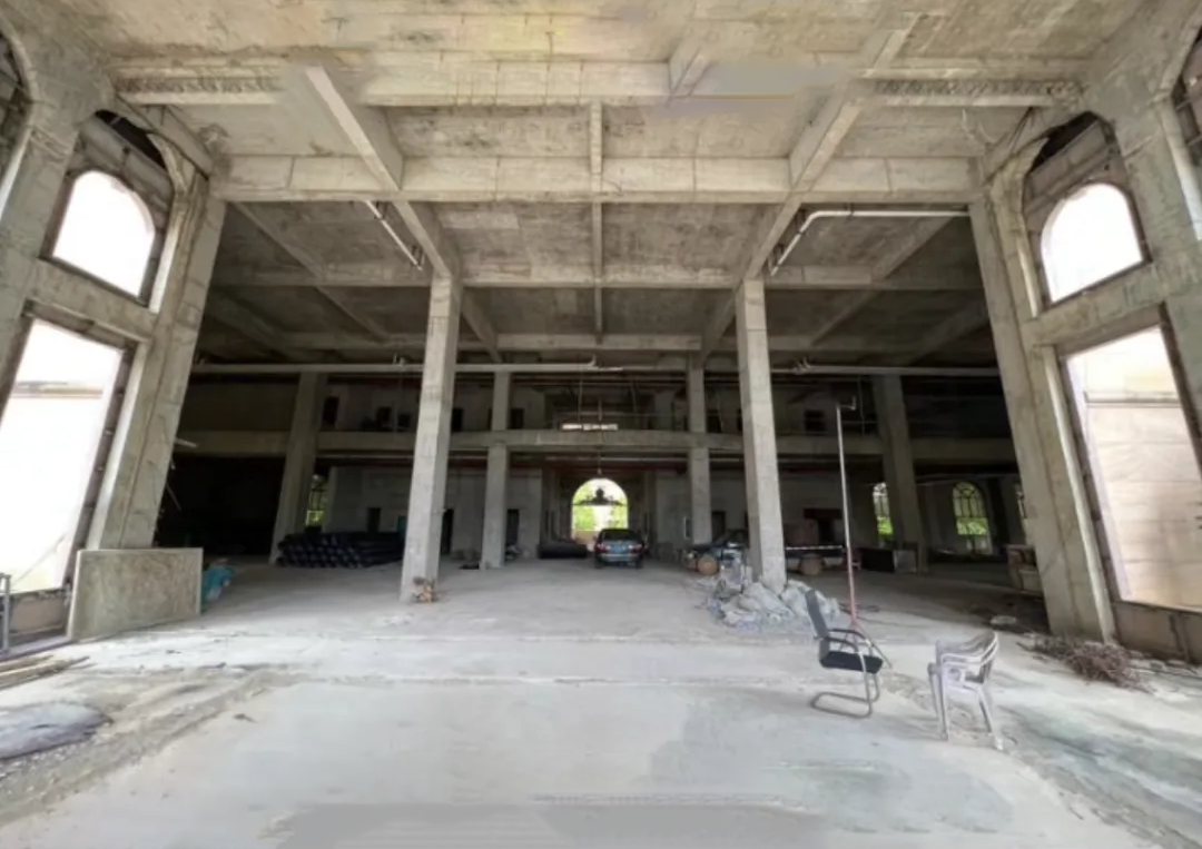 步入其中,空旷中回响着无声的叹息。大厅里只有水泥柱森然伫立,地面凹凸不平,散落的塑料椅歪在角落,窗洞空洞,未曾迎来明亮的玻璃。