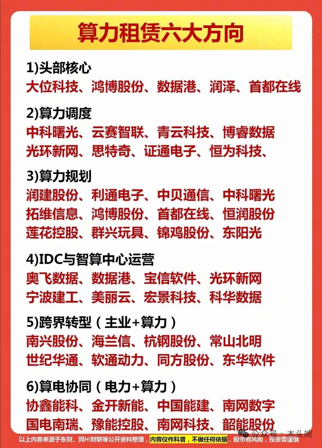 个人观点,仅供参考:算力概念当前最核心的方向,集中在AI算力租赁与智算中心、IDC算力基建、算力硬件(服务器、芯片、光模块)、算电协同及液冷四大主线。