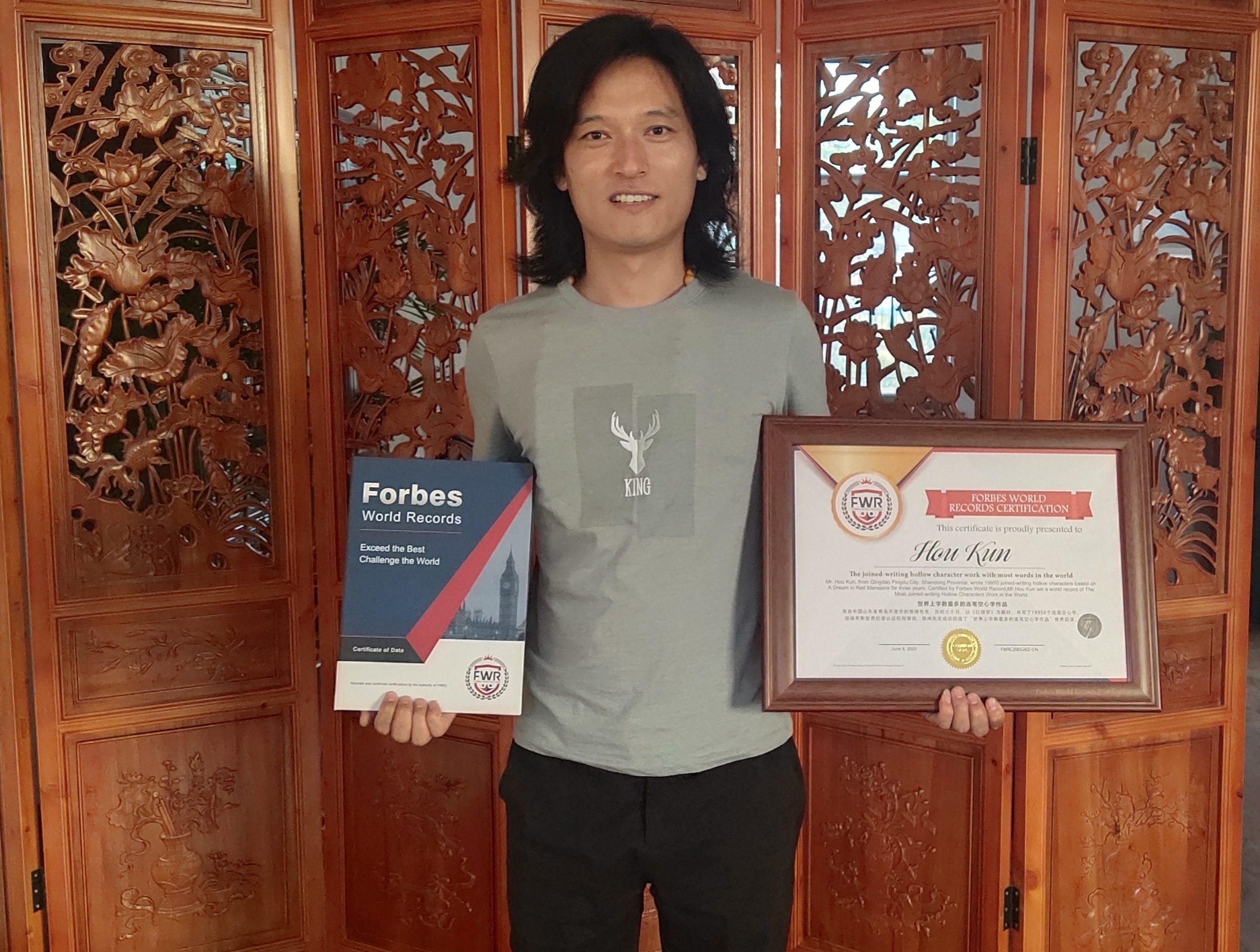 来自中国山东省青岛平度市的侯坤,以《红楼梦》为题材,书写了19950个连笔空心字。该作品用时三个月,书写面积1.97平方米。2020年6月5日,经福布斯世界纪录认证机构审核,侯坤先生成功创造了“世界上字数最多的连笔空心字作品”世界纪录。