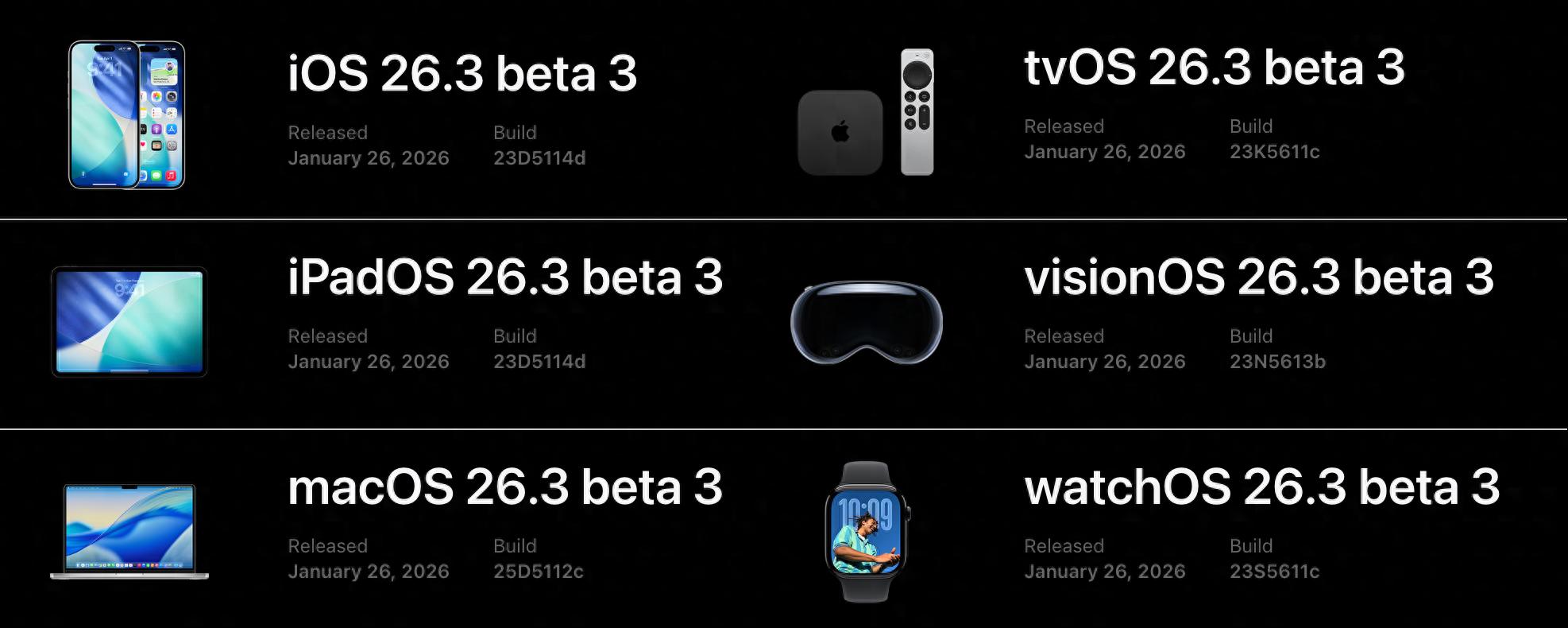 除了 iOS 26.2.1 正式版之外,苹果在今天(1 月 27 日)凌晨还同步推送了新一轮开发者测试版更新,包括 iOS 26.3 Beta 3 在内,iPadOS、watchOS、macOS 等系统也全部迎来 Beta 3 版本,距离上一次测试版更新正好过去两周。