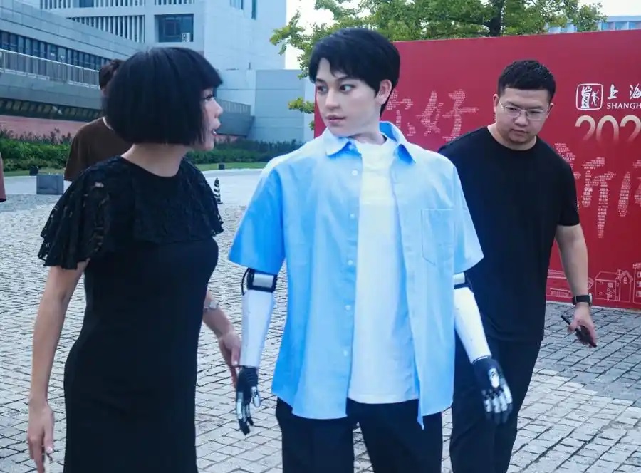 比他(它)高一些的主持人潘涛在教室里与其握手,两人很正式地自我介绍。他的专业大方向与“学霸01”一致,但是师从上戏电影学院副院长、董健教授。杨青青教授有意让“学霸01”穿短袖衬衫——露出了机械臂。故而潘涛并没有“完全进入角色”,而是一边与这位新同学握手,一边如主持人一般向旁人介绍这位新同学,所以会忍不住感慨道:“没想到具身机器人的发展这么迅速!”此时还与潘涛握着手的“学霸01”已经“侦测”到潘涛潜意识里视其为机器人,就接话道:“我不是机器人,我是博士生哦!”众人忍俊不禁。