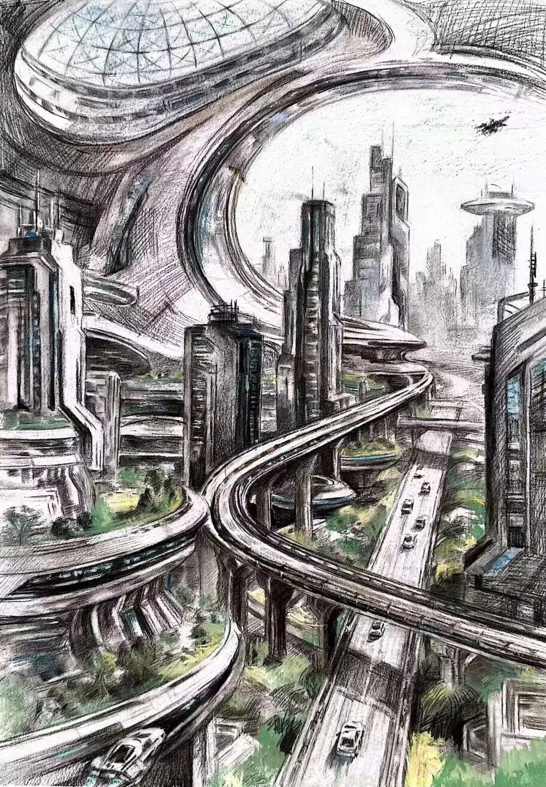 画作以冷峻的黑白灰基调构建出极具纵深感的未来图景,强烈的明暗对比与错落的线条精准勾勒出都市建筑的磅礴气势,将科技的冷峻与艺术的细腻完美融合,展现出超乎年龄的空间想象力与绘画功底。