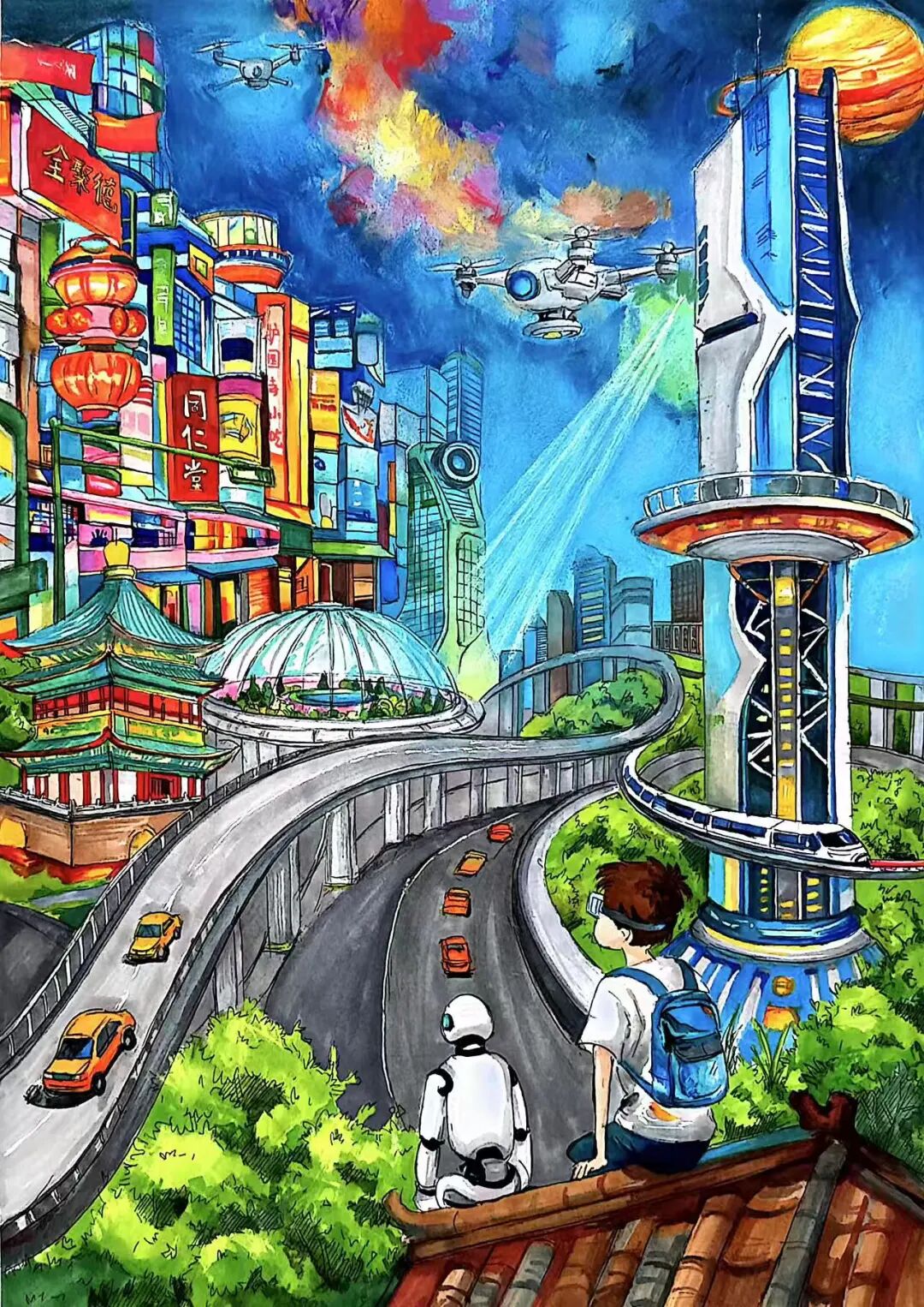 刘鹭洋同学凭借作品《未来国风都市》摘得奖项,画作将中华优秀传统文化与未来科技场景巧妙融合,笔触细腻、意蕴深远,既展现了对传统文化的热爱,也彰显了新时代青少年开阔的视野与丰富的想象力。