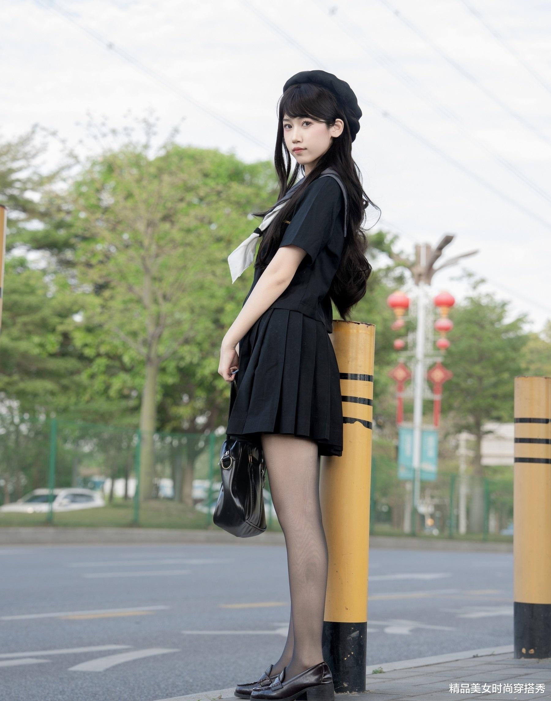 👠黑色小皮鞋与制服相得益彰,复古又俏皮。搭配黑色丝袜,更显腿部线条修长,每一步都散发着自信与魅力。👣