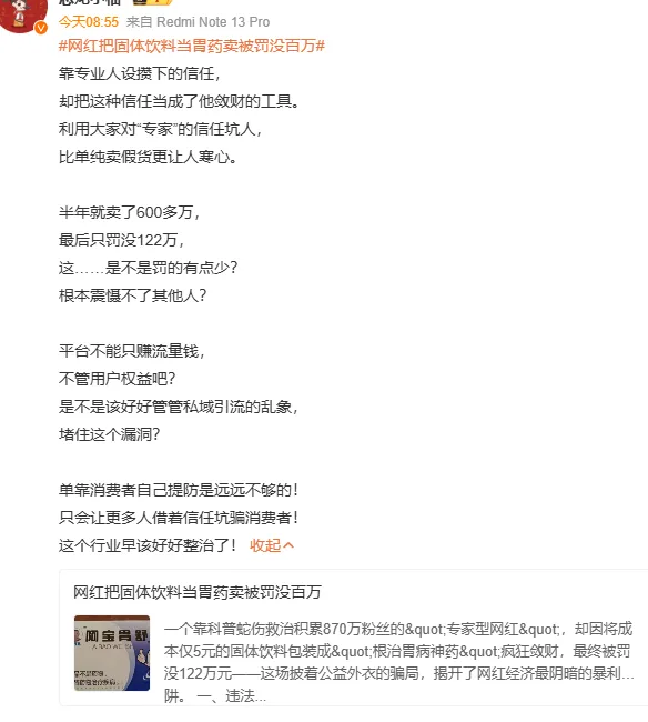 而面对4500%的利润率,网红们能不心动吗?有网友对此表示:靠专业人设攒下的信任,却把这种信任当成了他敛财的工具。利用大家对“专家”的信任坑人,比单纯卖假货更让人寒心。