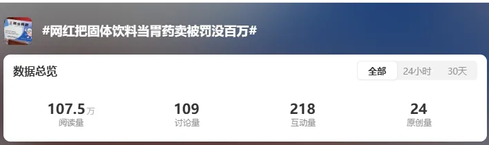 同时,该博主还进一步揭开了该网红售卖假药的真相,博主称,其在直播间,将一款三无固体饮料当药卖。并宣传具有治疗胃胀、胃酸、胃反流等功效,并使用"根治三十年老胃病""三盒见效"等医疗话术引导消费者停用正规药物。