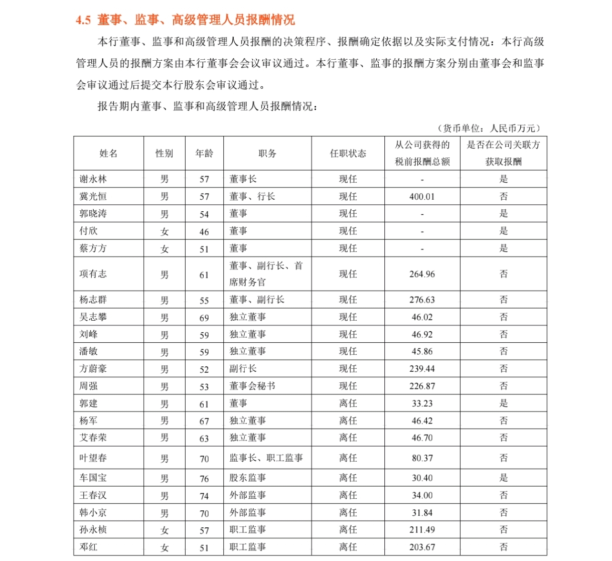 平安银行高管薪酬