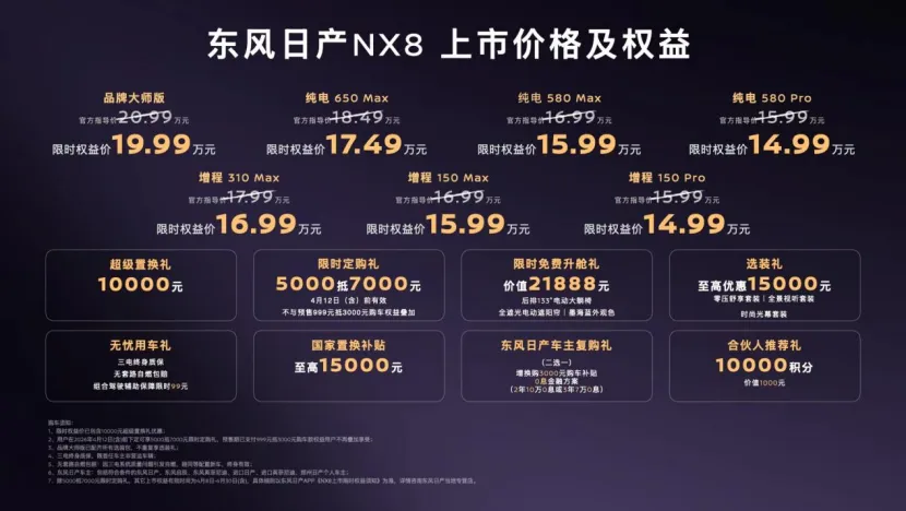所以,NX8强调的也是一种“花里胡哨干脆不要,高频需求尽量做精”:4米8的尺寸却有5米级的空间,防晕车、大床房、Ai自适应座椅……那么相比其他大而全、什么项目都想尝尝味的选手。此外,相较而言,日产NX8在定价上更有诚意,起售价下探至15万元以内,同时提供增程和纯电动力可选,满足更多消费群体选择,加上入门即高配,进一步拔高性价比。