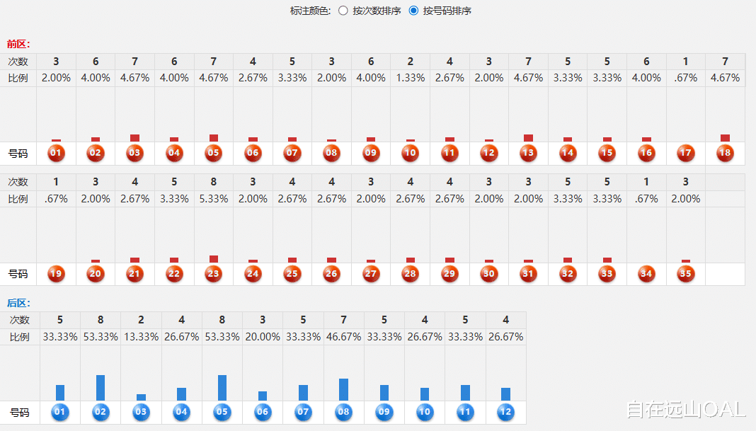 另外,前区热号表现突出,03、05、23、26均为近10期出现4次的高频热号,延续了近期热号连出的规律。
