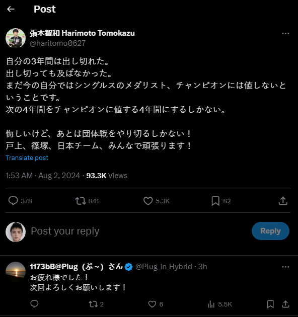 日本网友b:这是一场很棒的比赛。 到目前为止,还没有哪位选手给中国王牌制造过任何麻烦。 张本的斗志和技术令人惊叹,他拉回了开始对对手不利的势头。 我兴奋极了,在电视机前挥舞拳头欢呼雀跃。 还剩下团队比赛。 请继续向我们展示具有挑战性的比赛。日本网友c:感谢你们带来了精彩的比赛。我们也支持团队比赛。我对张本的表现感到鼓舞,我希望看到他尽可能长时间地参加奥运会。