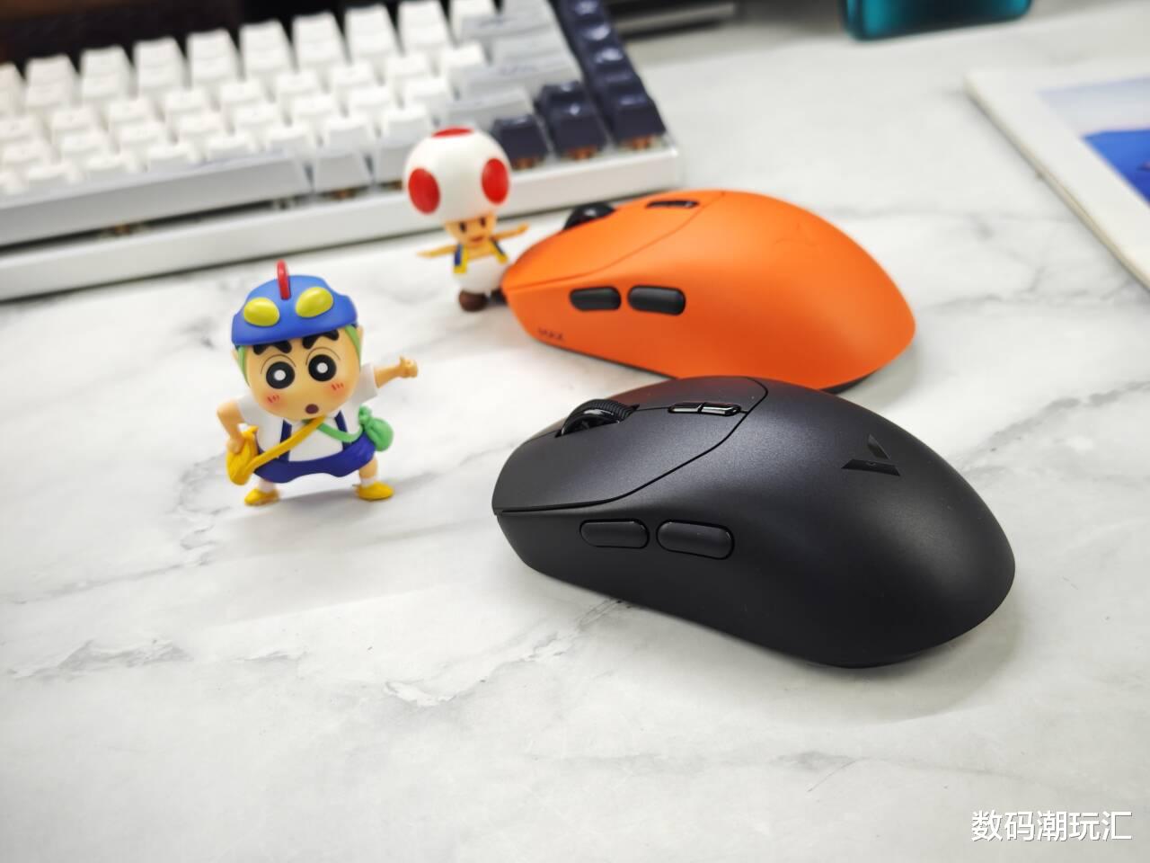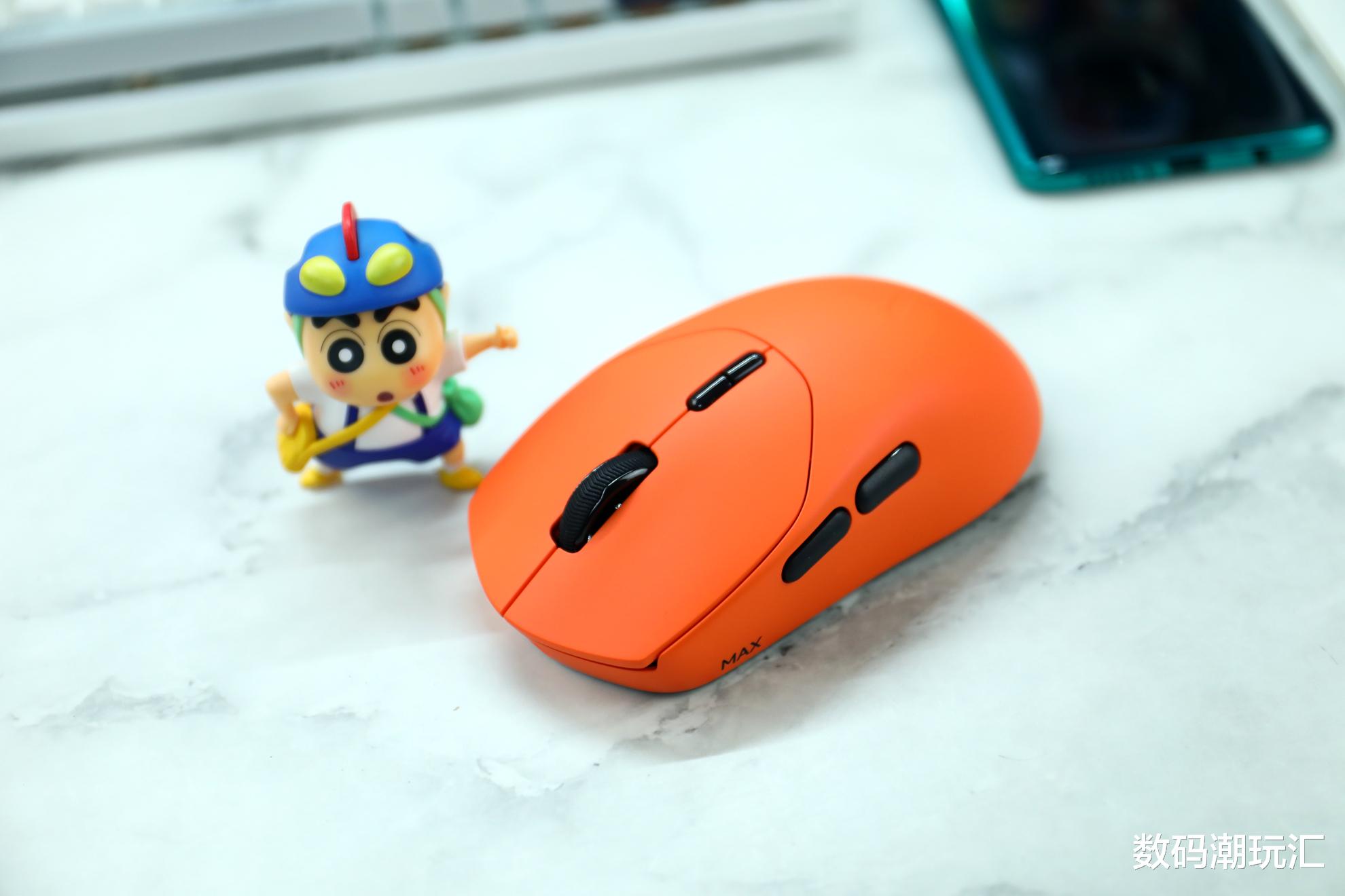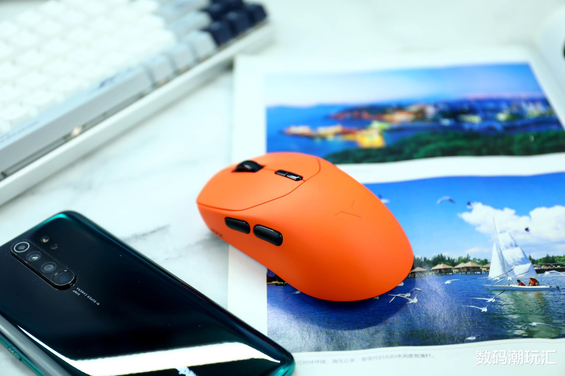重点来看鼠标本体 ——VT1 系列提供焰影橙、星空黑、皎月白三种配色,我入手的VT1为星空黑色,还有一个皎月白的颜色,采用类肤磨砂工艺,触感细腻不沾指纹,哪怕长时间握持出汗,也不会有打滑的黏腻感;49g的重量,拿在手里几乎没 “坠手感”,对中小手玩家的手腕很友好。VT1 MAX全配色和VT1焰影橙均为亲肤防滑涂层,VT1 MAX 我拿到的是焰影橙配色,这个配色堪称 “颜值担当”—— 鲜活透亮的橙色调,不是暗沉发灰的廉价橘色,自然光下能透出细腻的光泽感,既保留了亲肤防滑的实用性,又比普通电竞鼠标多了几分视觉冲击力,摆在桌面上一眼就能注意到,很对喜欢个性电竞桌搭玩家的胃口,我宣布这个鼠标以后就是我的主力了。
