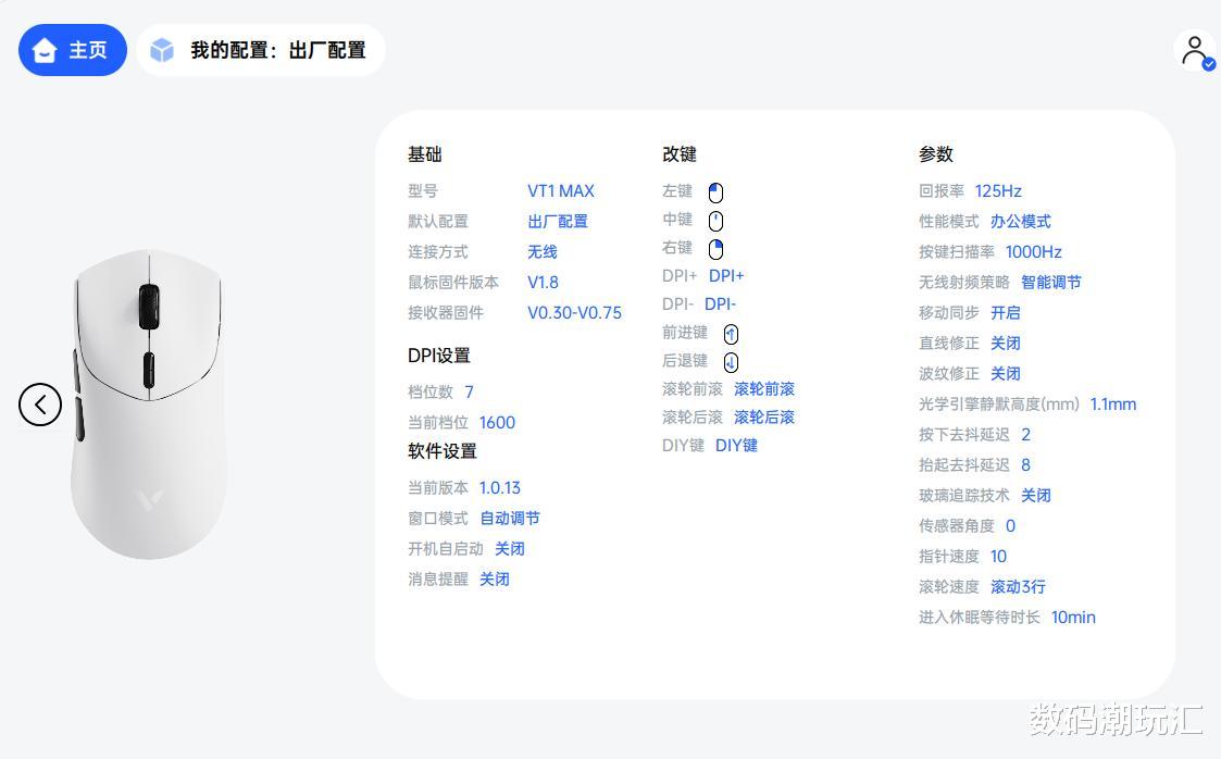 ● 基础参数:精准到 “每一档” 的细节调控DPI 设置支持 “精细化步进”——VT1 的原相 3398 传感器可从 50-26000DPI 以 50 为单位调节,VT1 MAX 的 3950 Ultimate 传感器更支持 10-10050DPI 以 10 为单位微调,比如我打 CS2 习惯 800DPI,若觉得横向移动稍慢,可单独把 X 轴 DPI 调到 850,纵向保持 800,适配不同玩家的 “手型偏科”;回报率则提供125/250/500/1000/2000/4000/8000Hz 七档选择,搭配 “续航计算器” 实时显示不同组合下的剩余电量,比如 4K 回报率下,VT1 续航约 150 小时,完全能满足周末 “连肝” 需求。