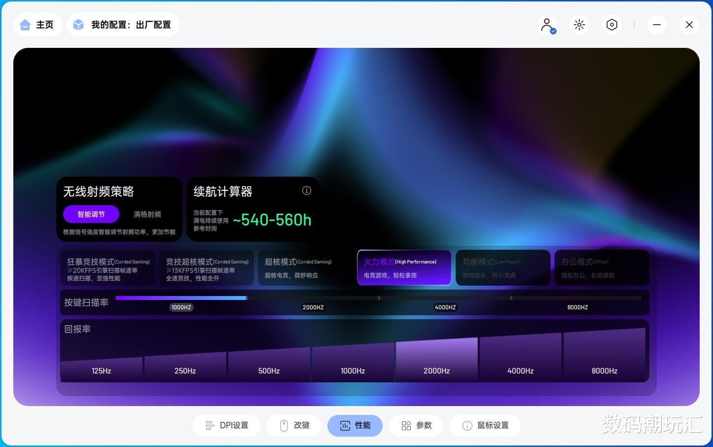 ● 场景化固件:一键切换 “竞技 / 办公” 双状态驱动内直接开放 6 种性能模式固件,玩家可根据场景自定义:CS2 等 FPS 游戏选 “狂暴竞技模式”≥20000FPS 扫描帧率或 “竞技超核模式”(VT1≥10000FPS),高帧率带来更强跟手性;日常办公切 “办公模式”,自动降至 1K 回报率 + 低功耗,续航拉满;还有 “火力模式”(适配 MOBA 游戏技能连招)、“均衡模式”(日常浏览)可选。更实用的是 “配置文件跟随应用切换”,我预设了 “CS2 = 狂暴竞技 + 8K 回报率”“Word = 办公模式 + 1K 回报率”,打开对应软件时驱动自动切换,不用手动调参数,对懒人玩家太友好。