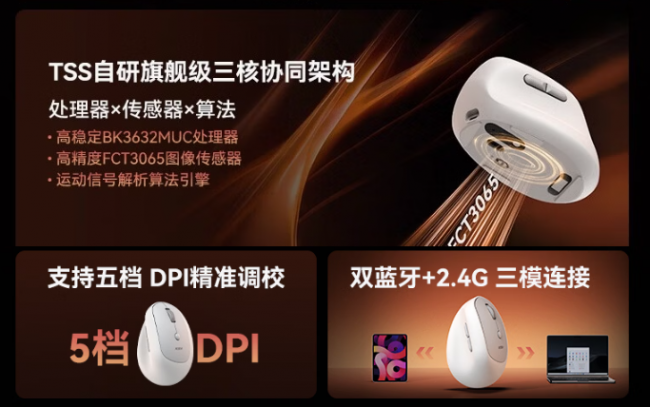 西圣M1人体工学鼠标支持800/1200/1600/2400/3200DPI五档调校,配备双蓝牙+2.4G三模连接,可同时连接3台设备自由切换,并搭载500mAh大电池与三段式智能休眠功耗管理,辅以轻音按键、精密阻尼滚轮和UV微纹理亲肤涂层。西圣M1凭借这套配置,在百元价位中把人体工学体验、操控稳定性与续航表现都拉到了很高水准,堪称同级少有的全能型人体工学鼠标。