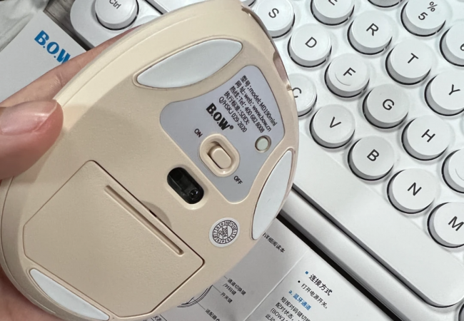 B.O.W 航世 MD190L mini 的核心卖点还是在握持姿势上,53°的人体工学倾角让手腕保持相对自然的中立状态,减少长时间使用时手腕的内旋压力,对于10.5–11.5cm大小的中手用户来说握持舒适,手指不会悬空或蜷缩,整体操作更轻松。机身尺寸 105.3×72.9×60.9mm,贴合中手掌型,配合表面设计,即便长时间办公也不容易疲劳。不过需要注意的是,相比垂直鼠标的57°倾角,53°角度对缓解腕部压力的效果略弱,对极易疲劳的手腕用户可能改善不如预期。