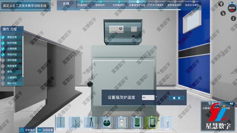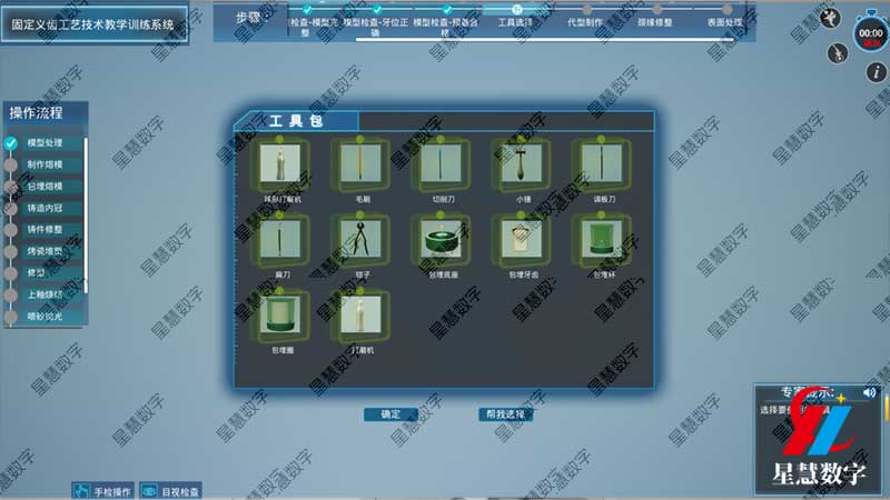 系统的教学价值首先体现在对规范化操作技能的强化训练上。它通过标准化的三维操作界面,引导学生严格遵循牙体预备的聚合度、肩台宽度等关键参数标准进行练习。例如,在铸造金属全冠制作中,学生需在系统中依次完成可卸式模型制作、蜡型雕刻、安插铸道、包埋、烘烤焙烧、熔铸及铸件清理抛光等全流程。每一步操作,系统都能提供实时纠错与智能引导,如对操作步骤进行提示、对相应器具进行高亮显示,并生成专家提示,帮助学生及时修正错误,避免了因前序步骤失误导致整个模型报废的传统困境。