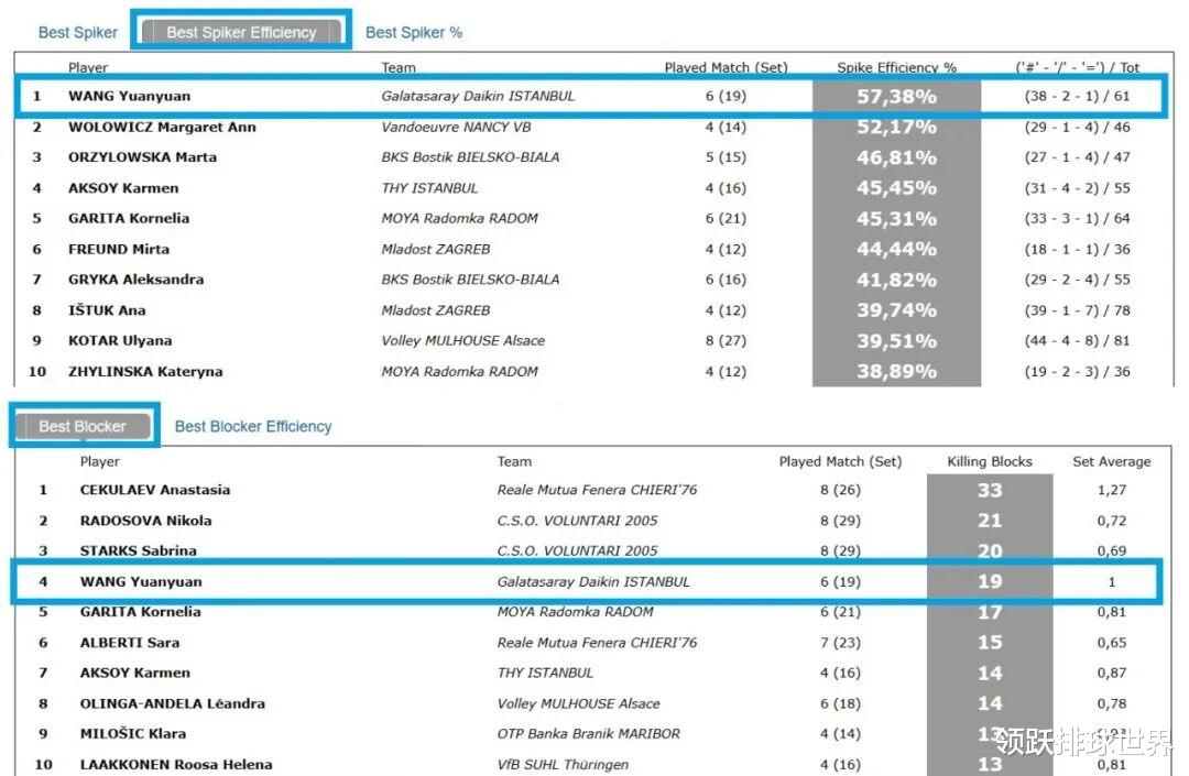 目前从整个欧联杯的数据榜单来看,王媛媛的表现同样亮眼:总体进攻效率(57.38%)排名第一,拦网数据(19拦)排名第四,这组数据不仅说明她的个人状态,更体现出她在欧洲赛场的适应度与稳定性。