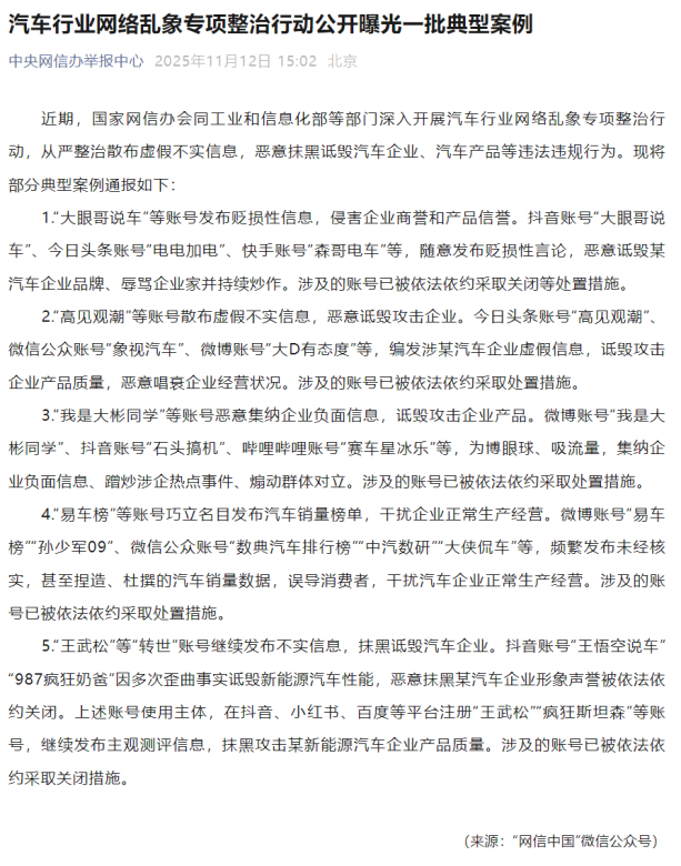 “王悟空说车”并非首个因诋毁比亚迪及新能源汽车而受到处理的自媒体。此前,中央网信办在通报汽车行业网络乱象整治典型案例时,已点名该账号及“987疯狂奶爸”存在歪曲事实、恶意攻击企业的问题,相关账号已被平台处置。