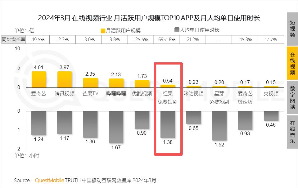 最初,很多古典文娱人是看不上竖屏短剧的。QuestMobile的报告,字节跳动旗下的,2024年3月的月人均单日使用时长已达1.38小时——一个靠分发切片视频的后来者,在用户停留时长这个核心资产上,直接分食了长视频巨头们深耕十多年的腹地。