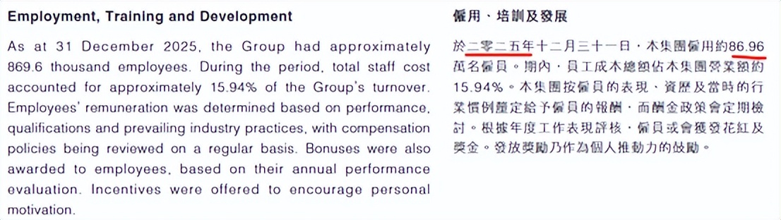 但是比亚迪在2025年里,员工总数从2024年底的96.89万减少到2025年底的86.96万。换句话说,比亚迪在2025年里,员工总数减少了9.93万,差不多减少了近十万人。这也就是说,2025年,近十万人从比亚迪失业了,没有工作了,这十万人的房贷、车贷以及老人与小孩的生活费都没有来源了。