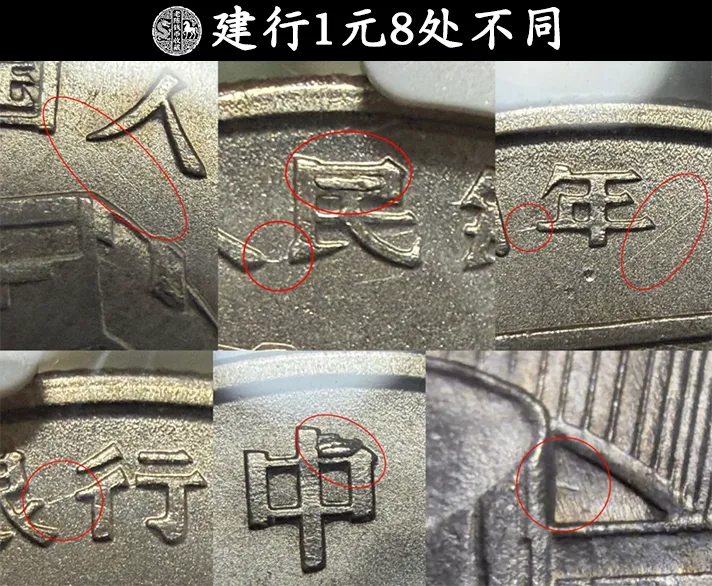 这枚建行1元是一枚MS 66分的评级币,不过它最大的特色并不在品相这上面。而在它币面上,总共8处不同的细节之处,相较于一般的只有一两处的,就更加珍贵了。