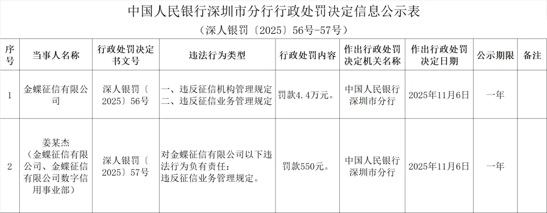 11月13日, 中国人民银行深圳市分行发布行政处罚决定信息公示表显示,金蝶征信有限公司(简称“金蝶征信”)因违反征信机构管理规定、违反征信业务管理规定被罚款4.4万元。与此同时,时任金蝶征信数字信用事业部的姜某杰因对相关违法行为负有责任,被罚款550元。