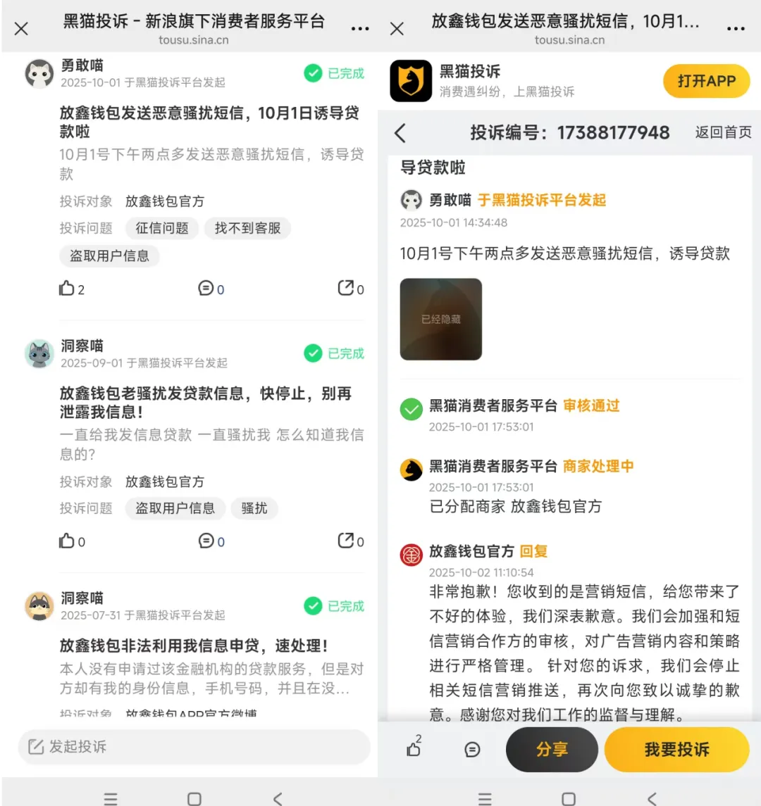 开甲财经注意到,在黑猫投诉(新浪旗下消费者服务平台)搜索“放鑫钱包”显示,多位网友反映,放鑫钱包发骚扰贷款信息。例如,10月1日,有网友反映放鑫钱包发送恶意骚扰短信,诱导贷款。