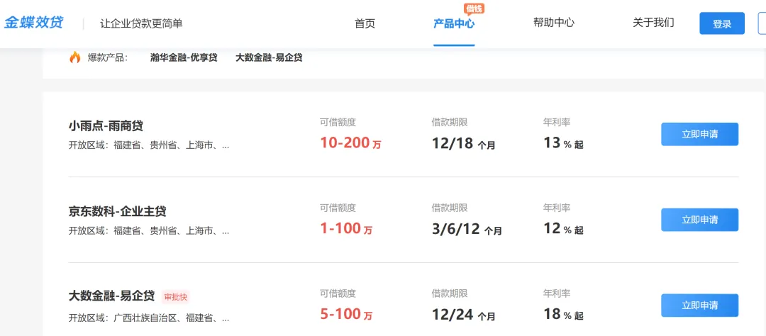 公开资料显示,金蝶效贷是金蝶旗下企业信用贷款,贷款产品包括:小雨点-雨商贷、京东数科-企业主贷、大数金融-易企贷、众邦银行-众商贷、瀚华金融-优享贷、民生银行-民生惠、交通银行-惠商贷、三湘银行-湘业贷等。