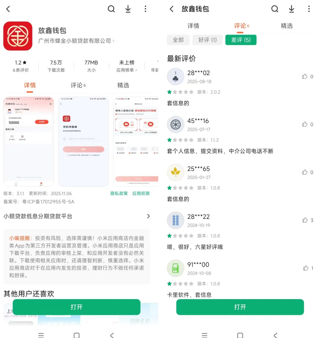 小米应用商店显示,放鑫钱包由广州市蝶金小额贷款有限公司开发运营,下载量7.5万次,有关“放鑫钱包”的6条评论中,其中4条评论提到“套个人信息”。