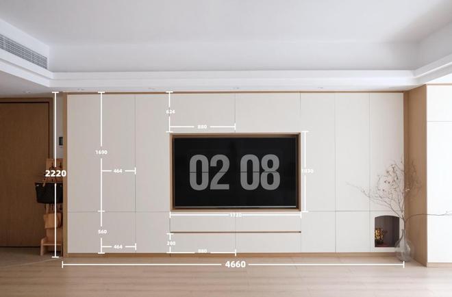 取消电视墙,用当下最流行的满墙柜来处理,可以说是最实用的设计了,尺寸为长466*高220*深40cm。