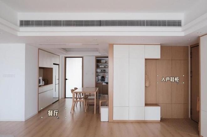 1)最左侧是一扇假柜门,背后是玄关区的换鞋架,弥补了拖鞋和外穿鞋的收纳。