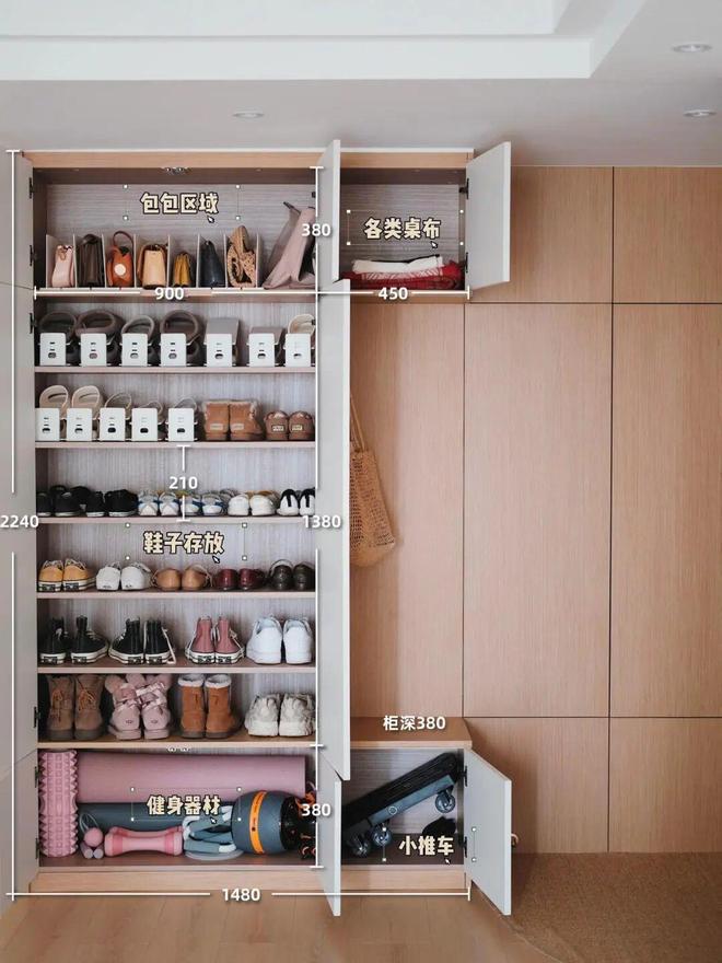 3)鞋柜内部做常规隔层处理,满足鞋子、包包、健身器材,以及折叠小推车收纳;外部预留换鞋位和挂衣区,动线清晰。