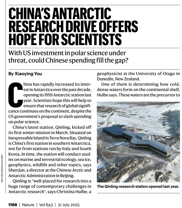Nature在2025年7月31日刊发一篇题为“《中国的南极科研发展为科学界带来希望》”的新闻文章,从中国南极科考40周年之际落成的中国秦岭站说起,对比了美国对南极研究投入的大幅减少,并通过采访新西兰、智利、韩国的极地研究科学家,对中国在南极科研的持续投入和快速发展给予了高度关注与肯定。