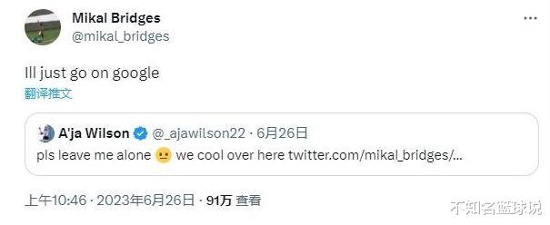 值得一提的是,尼克斯球星大桥布里奇斯还在效力篮网时,曾经通过社媒搭讪阿贾-威尔逊,询问阿贾-威尔逊何时下场比赛,却被直接回怼拒绝“离我远点”,也是让布里奇斯无奈回应:“我自己去搜索一下”。