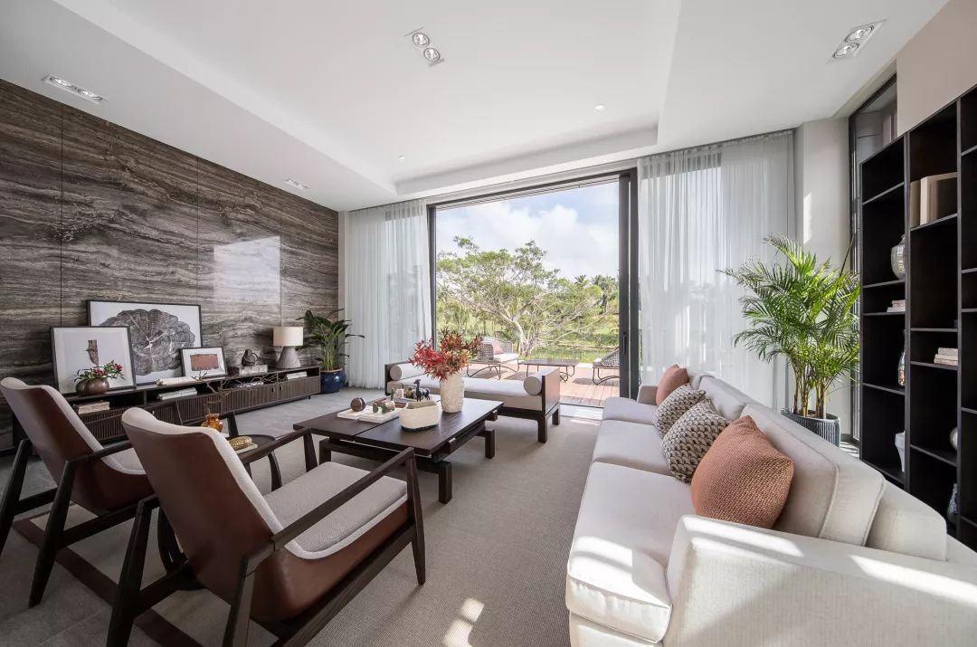 ▲客厅硬装部分以现代时尚为主,电视墙以灰色调的大理石质感,搭配上米白色布艺沙发,还有现代端庄的新中式风格茶几与沙发椅,营造出一种文雅端庄的高级空间感。