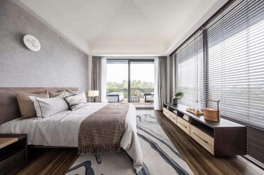 ▲卧室床头墙是灰色的,床尾是一面全景玻璃窗,装上百叶帘,平时开启后就能拥有一个无限的自然风光视线,侧边推拉门外面的露台,则是主人休闲活动的娱乐空间。