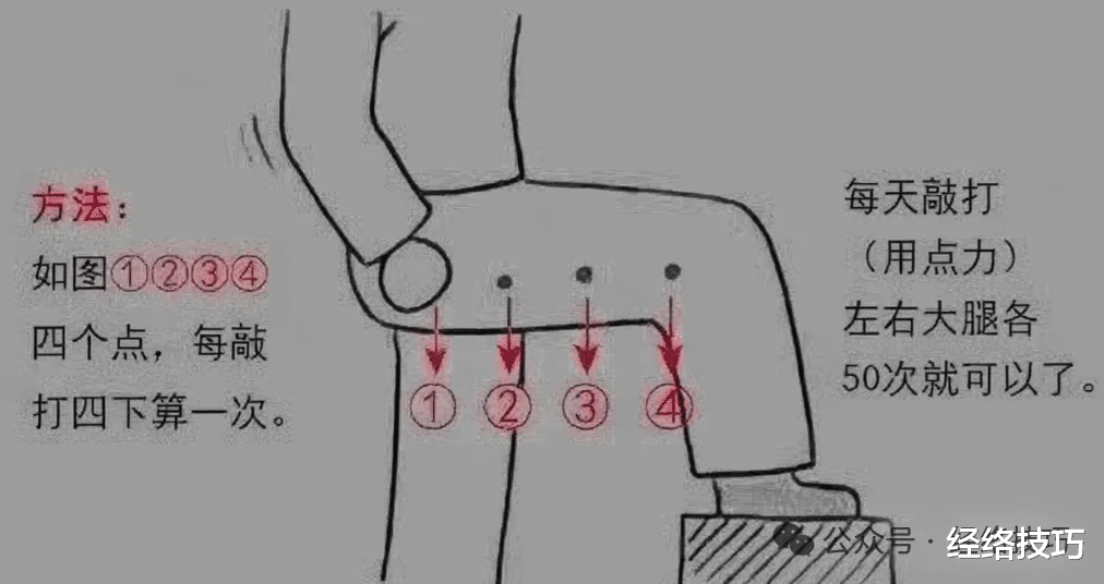 坐在床边,双腿垂下。双手握成空拳,从臀部外侧(也就是环跳穴附近)起,沿着大腿外侧中间,轻轻敲打到膝盖外侧,左右腿分别敲30次左右,力度要合适,有轻微震动感就行。