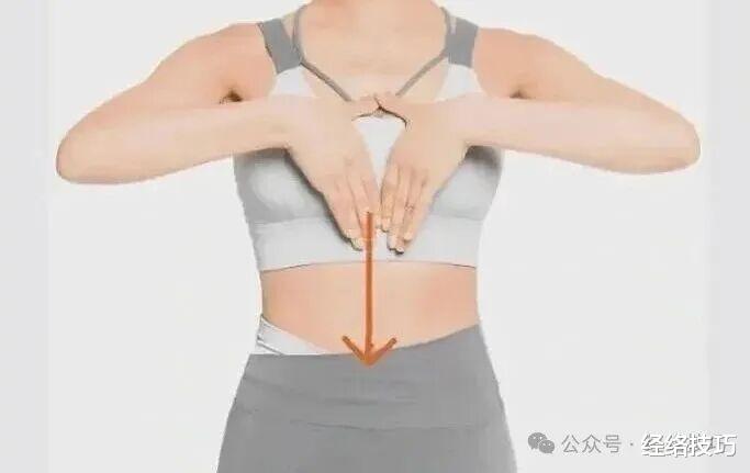 仰卧在床上或者坐好,双手叠放在心口窝下面(胸骨剑突下), 顺着肚子正中间的线,从上往下,轻轻地但有力地推到小腹,每推一次,重复大概30次,力度得合适,让腹部微微发热就行,这个动作能温和地推动任脉运行,脾胃是气血生化的源头,早上温和地唤醒它们,能给一天的气血运行提供基本动力。