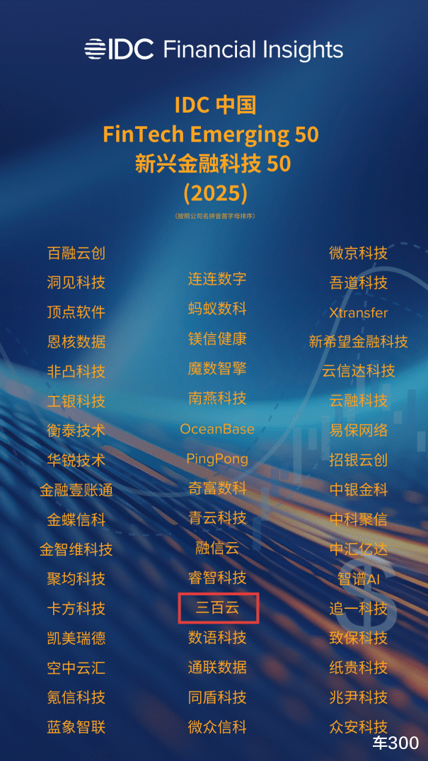 近日,国际权威调研机构IDC公布“2025年度中国FinTech Emerging 50”榜单,南京三百云信息科技有限公司凭借在汽车金融科技领域的持续创新与深度实践再度登榜。
