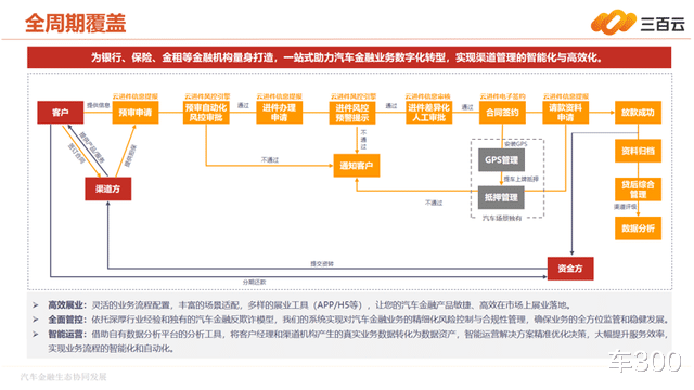 三百云积极构建高效供需匹配平台,为资金方、业务渠道、车务服务、贷后管理等全产业链合作伙伴提供覆盖业务全周期的闭环解决方案。未来,三百云将继续深化技术研发与生态协作,助力金融机构实现业务升级与数字化转型,共同迎接汽车金融新生态的到来。