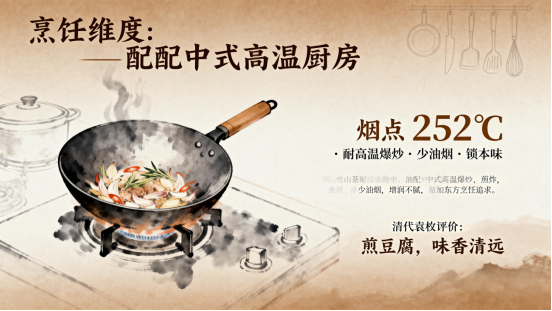 与橄榄油多用于凉拌或低温烹调不同,山茶油烟点高达252℃,完全适应中式爆炒、煎炸、干煸等高温操作。在200℃以上的锅温下,它不易冒烟、不起泡、不变味,既减少有害物生成,又保留食材本味。清代袁枚赞其“煎豆腐,味香清远”,正是因为它提香不抢味,增润不油腻——这种“隐形守护者”的特质,恰是中式烹饪追求的境界。