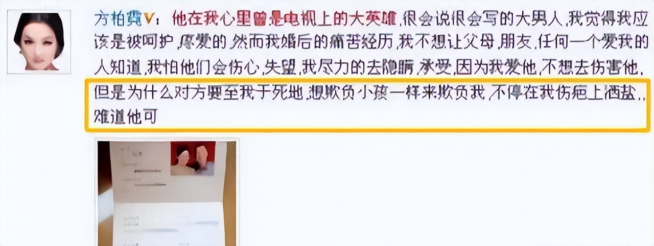 面对婚姻的一地狼藉,方柏霓忍无可忍最终在社交平台公开了于震的“罪行”。