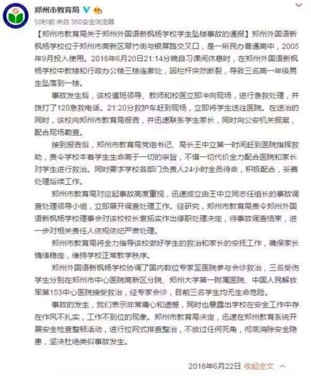 2018年6月20日,晚自习课间休息时,郑州外国语新枫杨学校(以下简称“新枫杨学校”)中教楼和行政办公楼三楼连廊处的栏杆突然断裂,三名高一年级男生坠落到一楼。当晚,三人被送医抢救。
