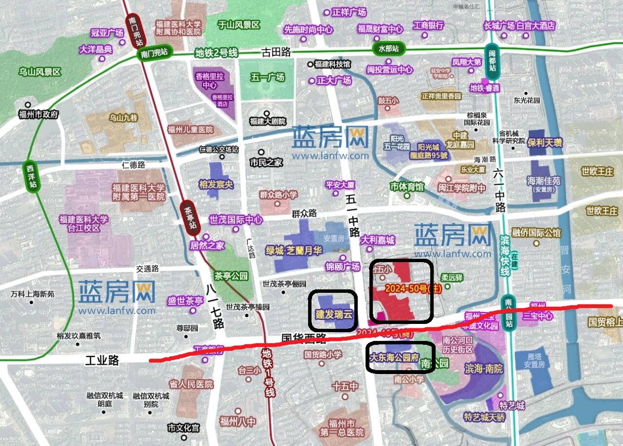 从沿线楼盘来看,正好近年台江的改善新盘,主要是建发瑞云、大东海公园府、以及部分沿街的榕发金屏垱。