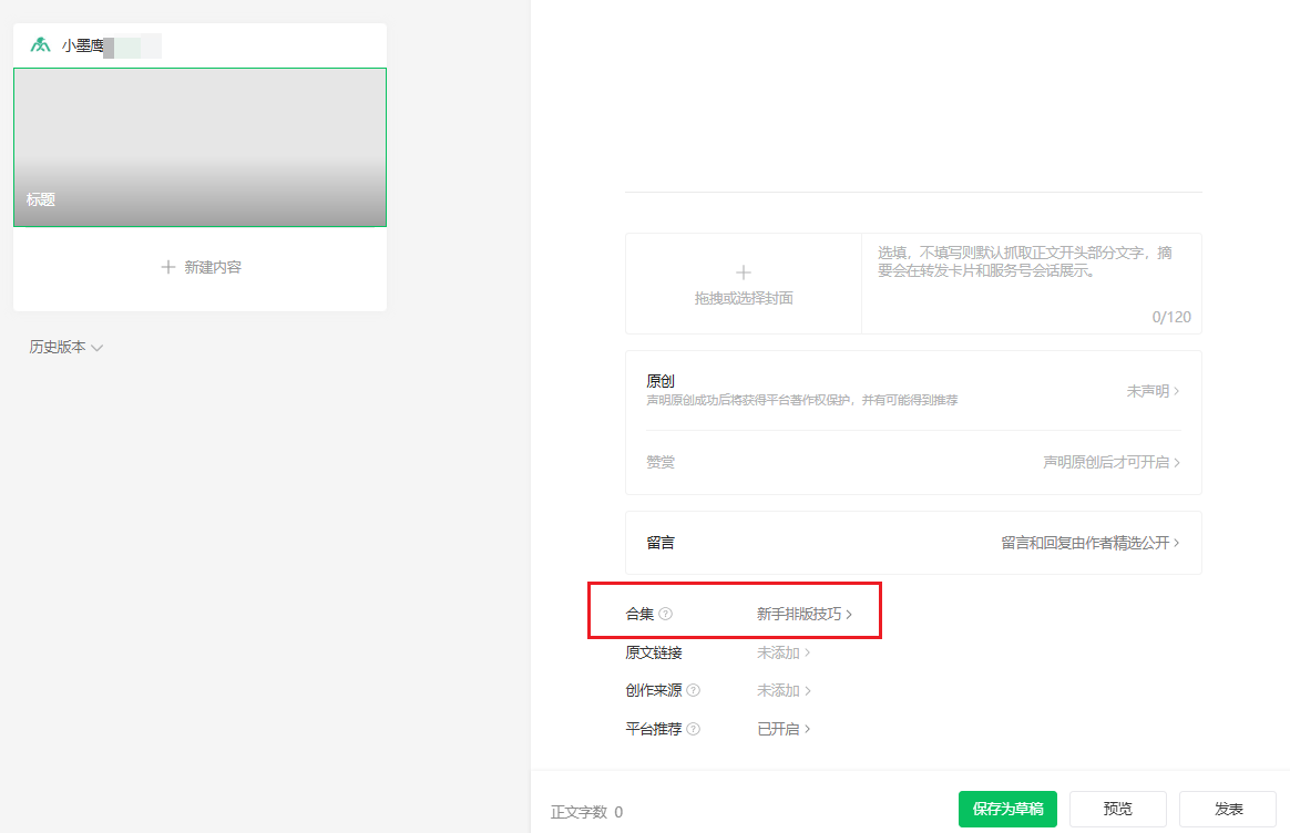 5、新建文章时,在底部 合集 选项里,选中你刚创建的合集,确定后发布文章。